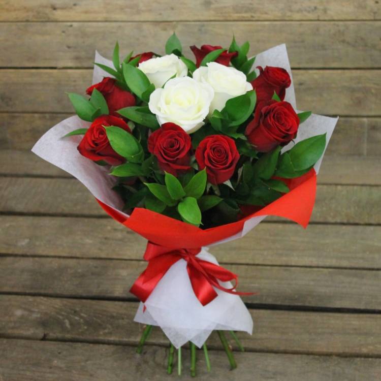 Из 15 красных и белых роз с зеленьюИз 15 красных и белых роз с зеленью